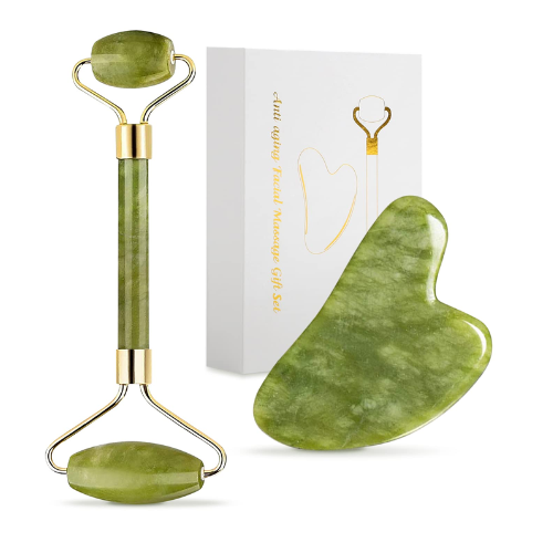 - Includes a facial roller (usually double‑ended) and a gua sha massage tool — both designed to be used together for facial massage.
